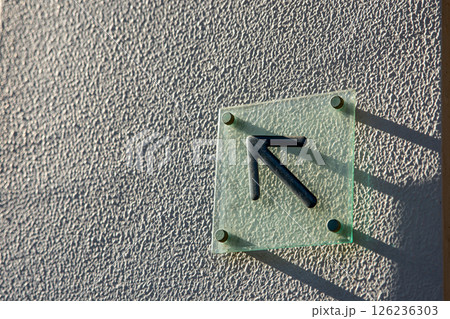 五浦岬公園展望慰霊塔 壁面ガラス矢印案内サインと斜光影