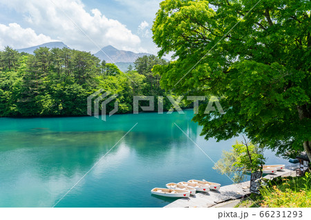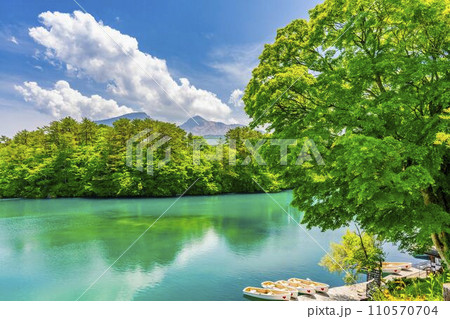初夏の毘沙門沼(五色沼)の風景 新緑と湖面 福島県北塩原村
