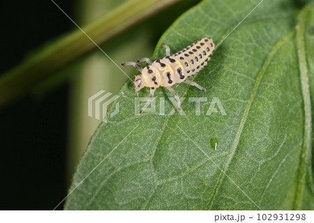 生き物 昆虫 キイロテントウ、幼虫です。可愛い姿の成虫と違いやや不気味系、色は親とほぼ一緒