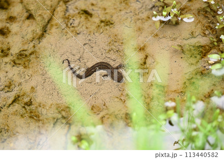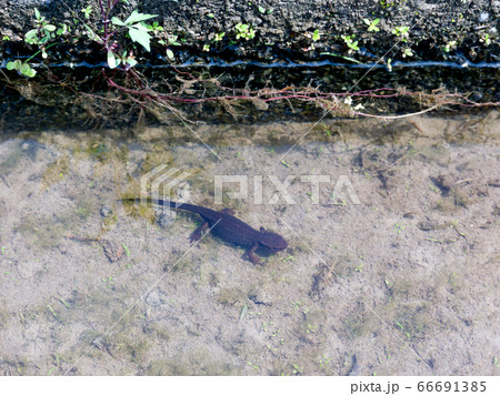 田んぼの脇の水路に住むイモリ、いもり、アカハライモリ