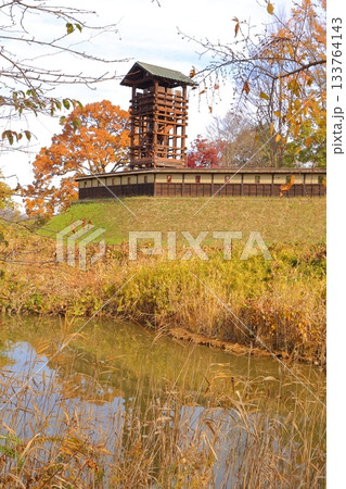 紅葉に包まれる逆井城の城壁と井楼矢倉