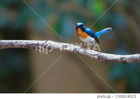 東南アジアの熱帯雨林で見られる美しい青とオレンジの小鳥、インドシナヒメアオヒタキ