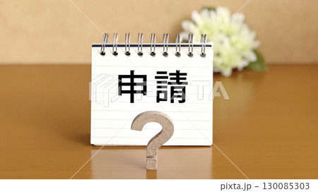 申請文字入りリングノートの正面にクエスチョンマーク_茶色背景