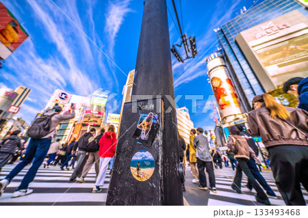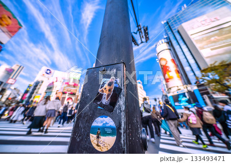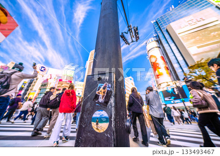 日本の東京都市景観11月24日、剥がされたシール…早くも4枚貼られ、必殺上貼りPR潰しも…=朝、渋谷