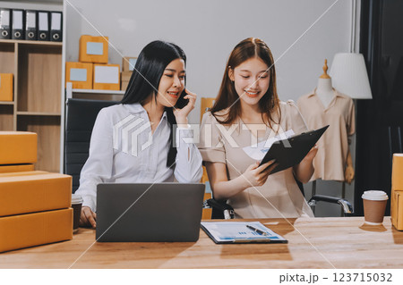 Two asian woman working while planning online business and checking order with writing on tablet.