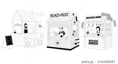 A line drawing illustration featuring three distinct small market stalls or kiosks, each representing a small business.
