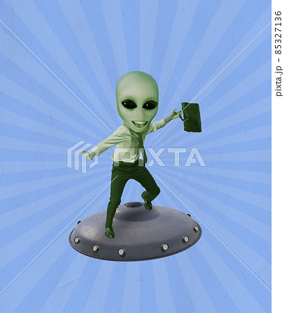 Happy green alien with human body surfing on UFO. Contemporary art collage.