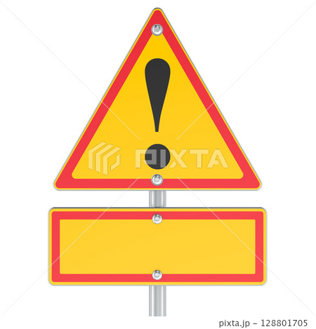 Yellow triangular warning road sign with exclamation mark and blank rectangular plate below. 3D rendering