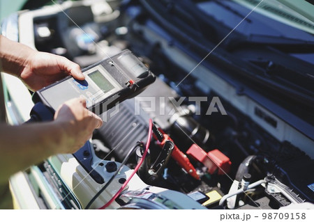バッテリー充電量を測定する自動車整備士