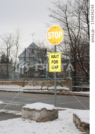 雪の街角に立つSTOP標識と注意看板のある道路風景