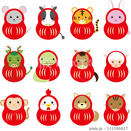 干支12支の赤いだるまのイラストセット