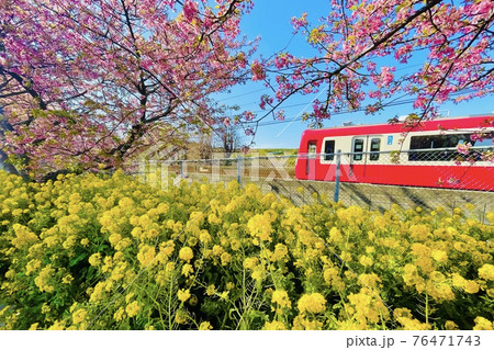 大岡川の春の風景 青空に映える桜 川沿いを走る京急線【神奈川県・横浜市】