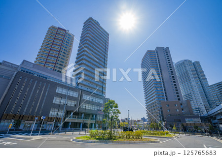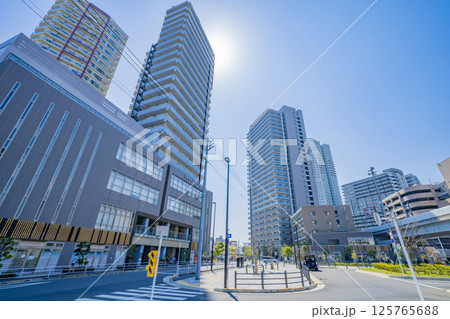 日本の東京都市景観 イーストコア曳舟二番館や電車などを望む