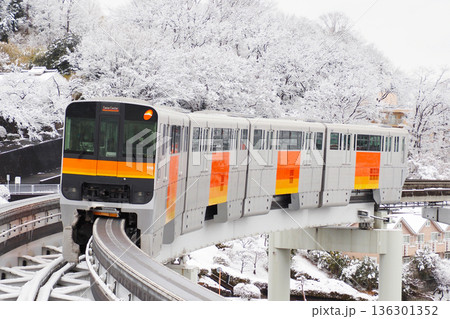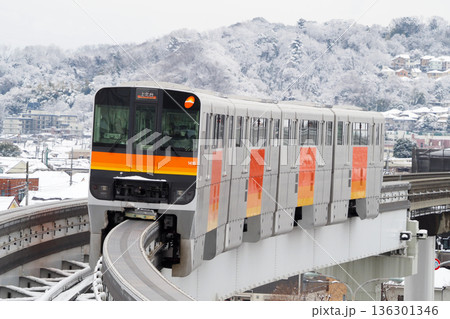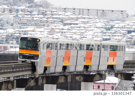 多摩モノレール_雪景色の住宅地を背景に