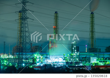 夜に輝く巨大プラントと送電鉄塔の工場夜景