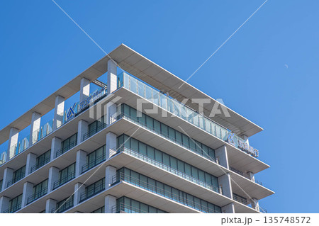 青空と月を背景にした京葉銀行千葉みなと本部の建物上部【千葉県千葉市中央区】