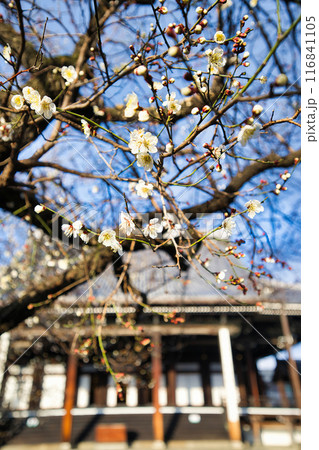早春の北野天満宮 三光門 綺麗に咲いた白梅とメジロ(京都市上京区馬喰町)