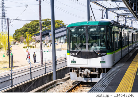 京都 宇治 京阪電車宇治駅のホームと電車(晩春)