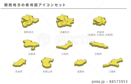 日本地図、関西地方の県地図アイコンセット、ベクター素材