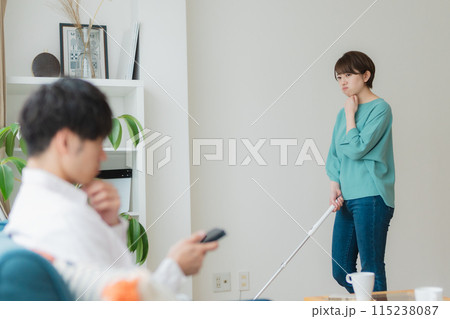 掃除をする女性とスマホをいじる男性