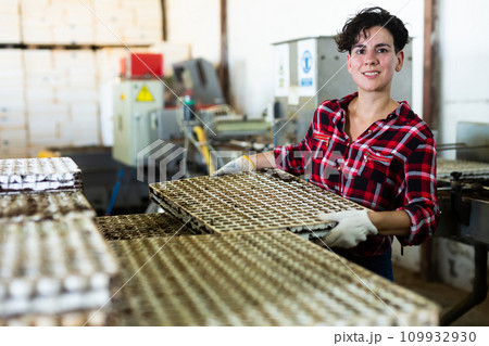 Successful poultry farm owner holding carton tray of eggs in chicken coop