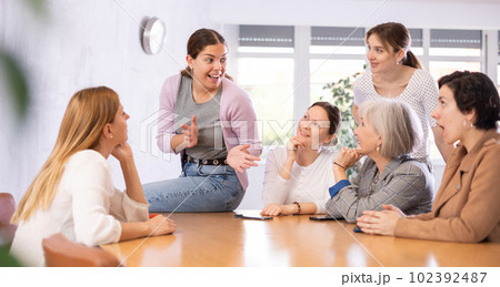Cheerful girl student talking with female coursemates of various ages