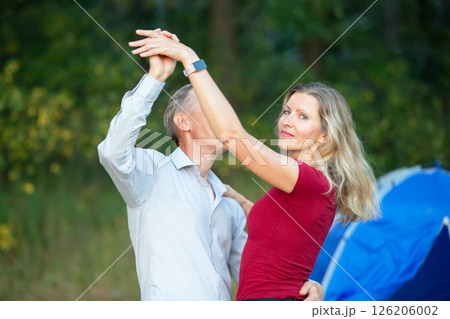 A beautiful adult woman is dancing with a man. She is looking at the camera and his face is covered with his hand.