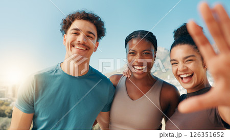 Happy people, portrait and fitness with selfie in nature for workout, exercise or memory together. Active, group or friends with smile in joy for photography, capture moment or health and wellness