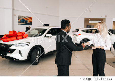 Successful blonde female buyer getting car key and congratulation from black auto dealer male while buying new auto in dealership. Happy young woman car owner during handing over keys at showroom.