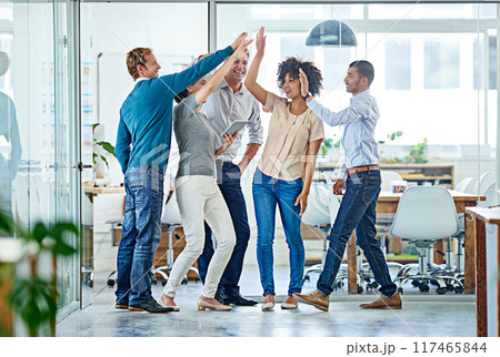 Creative people, success and high five in office for support, teamwork and collaboration with startup project. Business employees or group with hands together for job achievement, news or well done