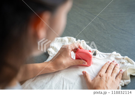 Close-up view of woman with a stamp with a name for signing children's things. Identification of personal clothing.