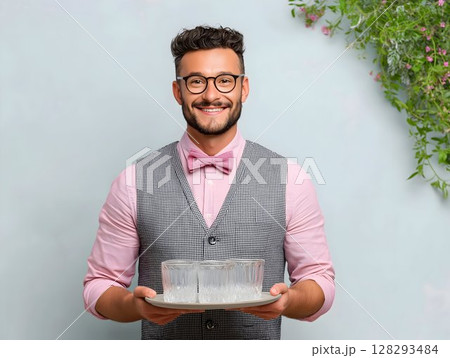 Beautiful confident waiter barista butler man holding tray with glasses in hand, stylish clothes and apron, working in trendy loft style cafe. Restaurant worker concept.
