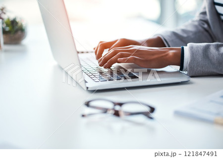 Closeup of hands of a business person typing on a laptop, browsing the internet online and finishing a proposal while sitting at a table in an office at work. One employee networking on the web