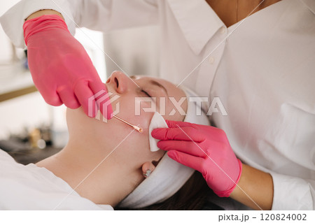 The beautician uses a hot pink glove to apply skincare treatment on the client, bringing a pop of color and uniqueness to the scene.