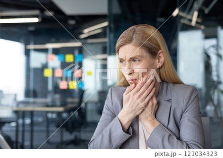 A mature woman businesswoman in a corporate office setting experiencing a toothache. She looks concerned, holding her jaw in discomfort.