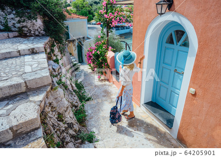 Adult female on summer vacation in Greece looking towards wonderful summer day. Cute woman leaving the house and exploring the town. Travel vacation, lifestyle carefree joy concept