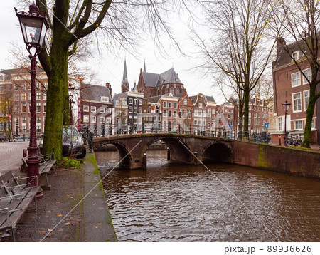 Panorama of the city embankment of Amsterdam on a sunny day.