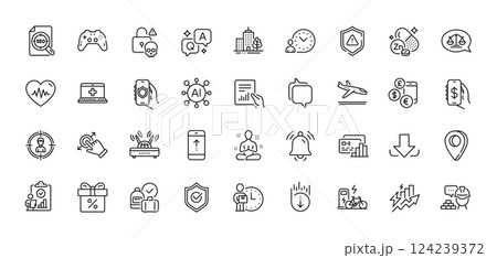 Document, Notification bell and Gamepad line icons pack. AI, Question and Answer, Map pin icons. Arrivals plane, Money app, Security app web icon. Vector