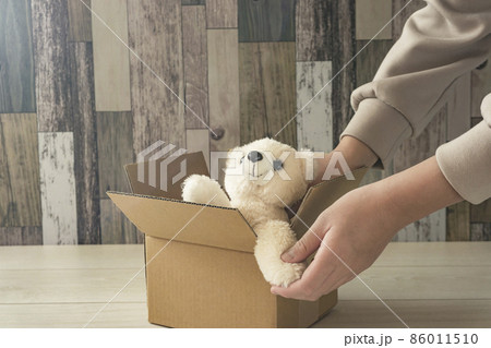 大切な人形を扱う子供。ダンボール箱の中のクマのぬいぐるみ。思い出の品物