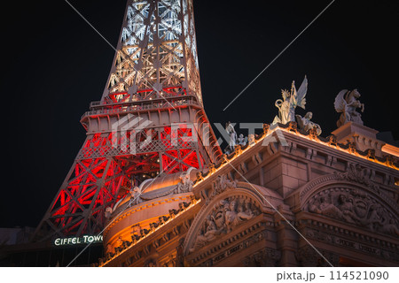 Close up view of a red lit Eiffel Tower replica at Paris Las Vegas Hotel and Casino on the Las Vegas Strip. Iconic landmarks and vibrant nightlife captured beautifully.