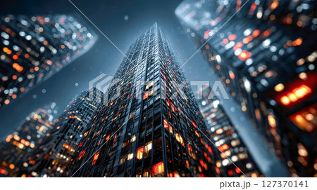 Futuristic city skyline with illuminated skyscrapers and blurred traffic lights at dusk