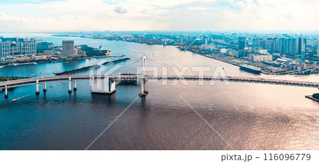 Aerial view of the Rainbow Bridge in Odaiba, Tokyo