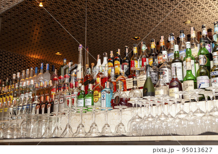Set of different colorful alcoholic cocktails - margarita, blue lagoon, cosmopolitan and other. Set of various classic cocktails on bar counter background. Selection cocktails and soft drinks