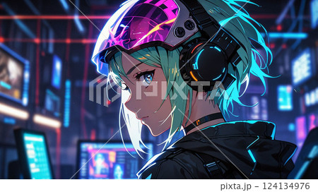サイバーパンク風 ネオンカラーが美しい少女 アニメ風「AI生成画像」