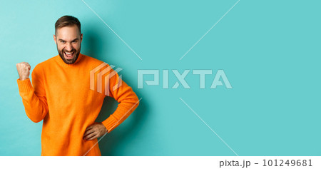 Image of satisfied young man feeling winner, fist pump and saying yes with satisfaction, achieve goal, triumphing while standing over light blue background