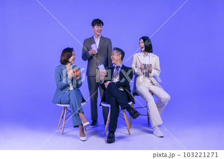 Asian Korean senior, middle aged and young male and female colleagues models in business attire, neon purple studio background, have a chat with coffee