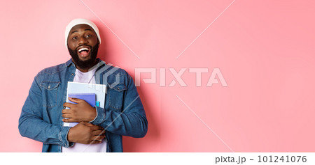 Education. Happy african-american male student in beanie holding notebooks, studying courses, smiling at camera, standing over pink background