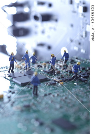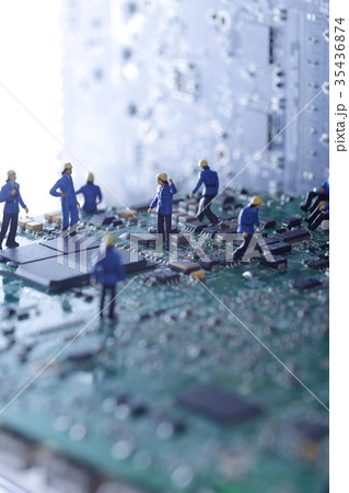 コンピューターの基盤の上にいる人間のミニチュア人形