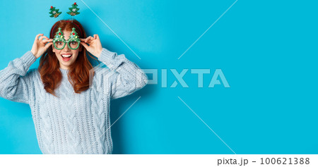 Winter holidays and Christmas sales concept. Beautiful redhead female model celebrating New Year, wearing funny party headband and glasses, smiling silly, blue background