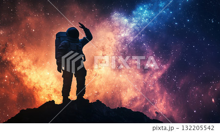 Silhouette of astronaut saluting stars with galaxy swirling behind in vibrant space colors, evoking wonder and exploration